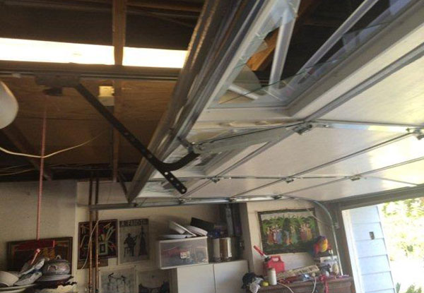 This garage door in Mission Viejo had a broom fall into its track while it was opening, which ended up breaking a window and separating the door from the horizontal and vertical supports. The homeowner called Alicia Garage Doors and we promptly fixed their garage door at an affordable price. This type of garage door damage is easily preventable by simply being careful about keeping items away from your garage door track.