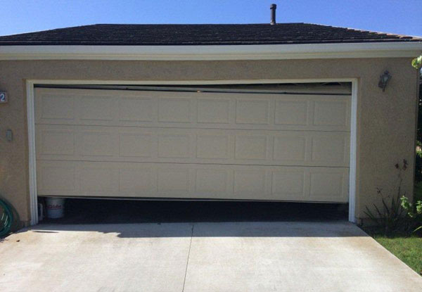 Before: This is a garage door repair at Monarch Summit in Laguna Niguel. The rollers came off the track and disengaged a portion of the door from the cables.